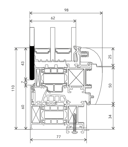 Стеклопакет: Несмотря на изящность профиля, система позволяет устанавливать структурные стеклопакеты толщиной до 64 мм, что гарантирует исключительную тишину и тепло в доме.