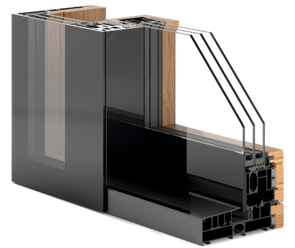 Внутренняя сторона портала сохраняет тепло натурального дерева и изящество линий, свойственное серии Slim. Снаружи здание приобретает футуристичный вид с чистыми зеркальными плоскостями, лишенными видимых переплетов и рамок.
